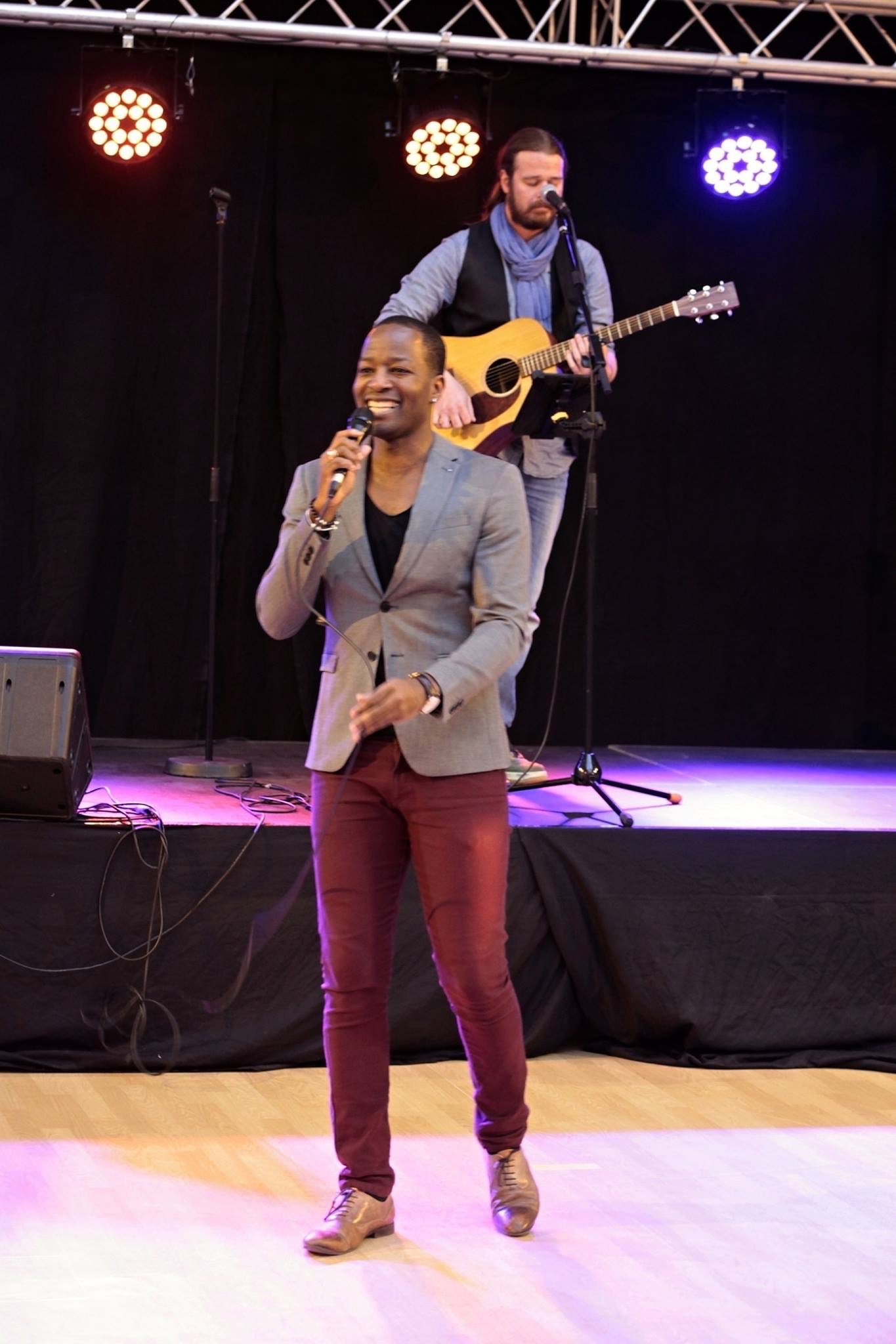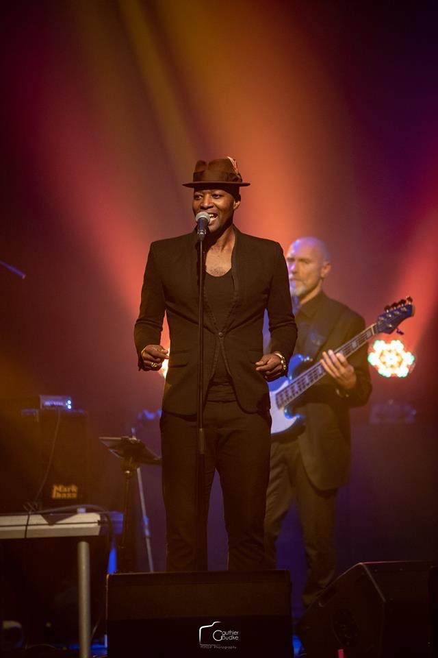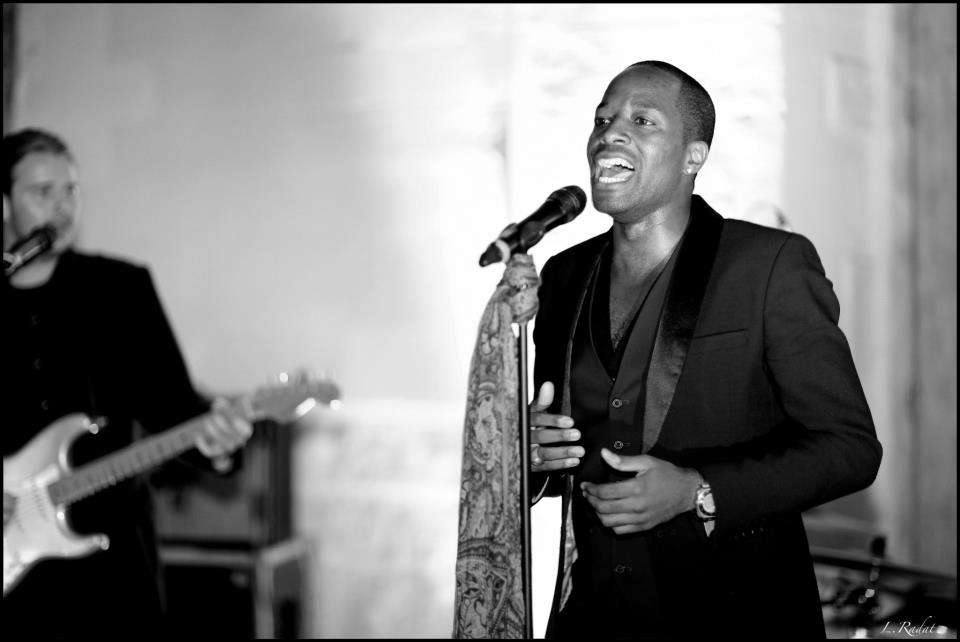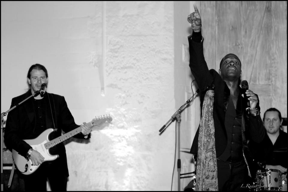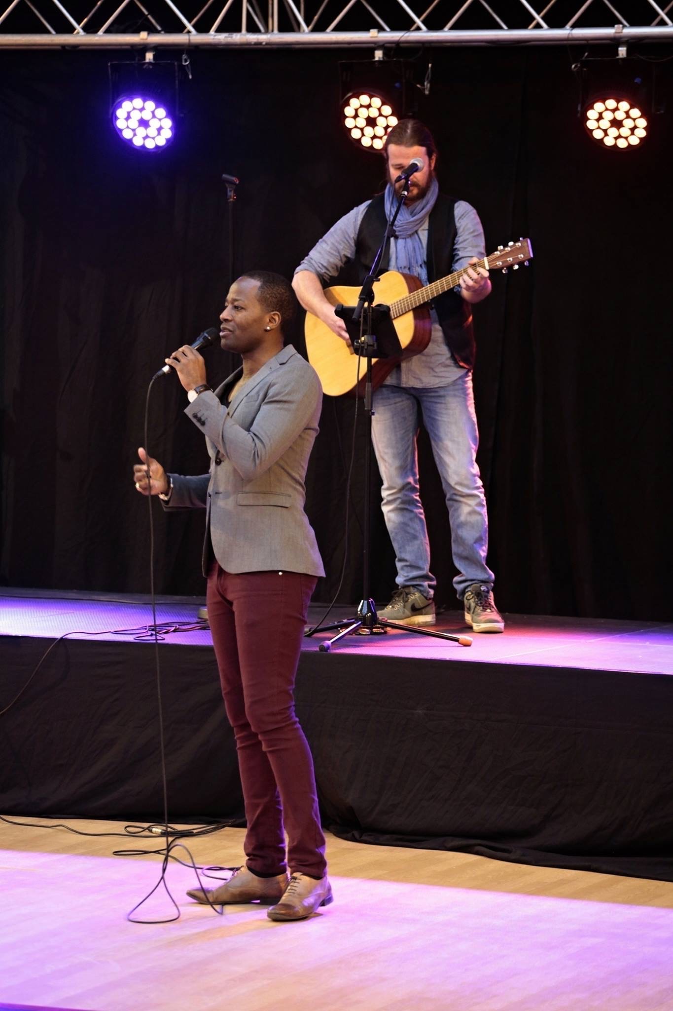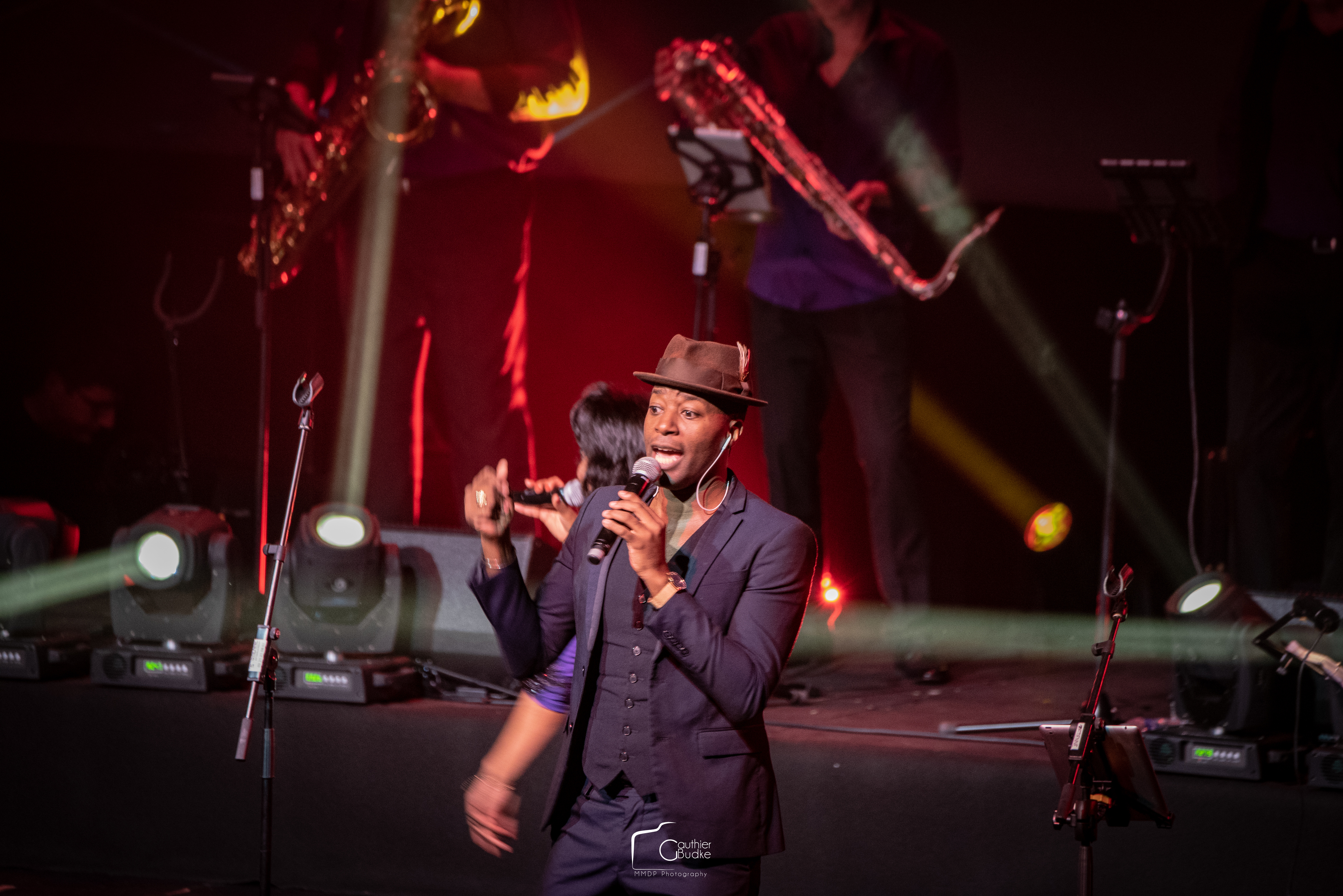 Plus de deux heures de spectacle qui ont réjoui le publique et qui a permis de récolter près de 3500 euros de dons qui seront reversés à la Cellule d’Aide aux Blessés de l’Armée de Terre. Chanteur accompagné par la musique des Forces Terrestres devant le publique.