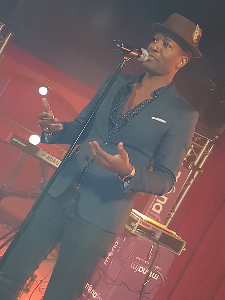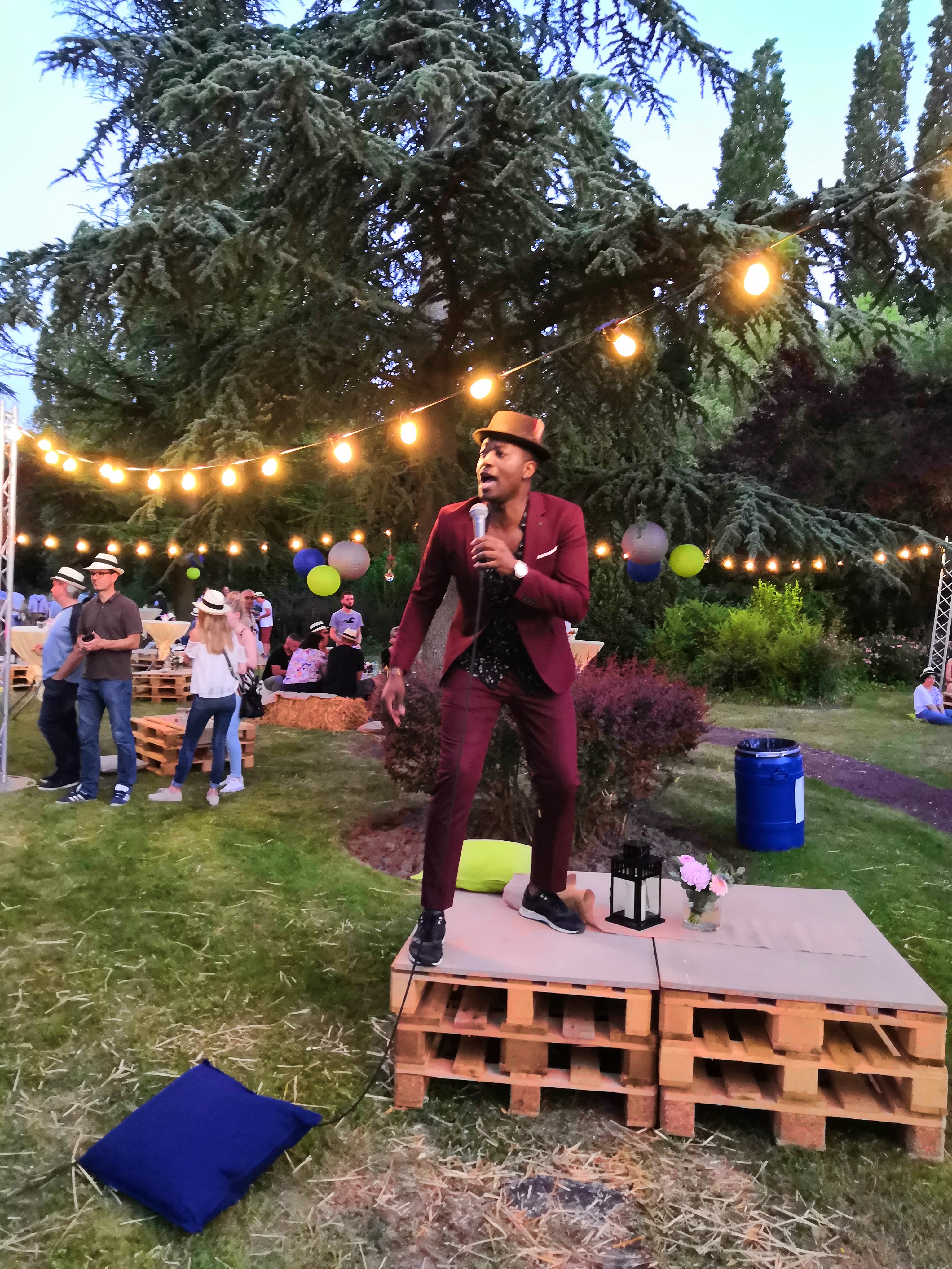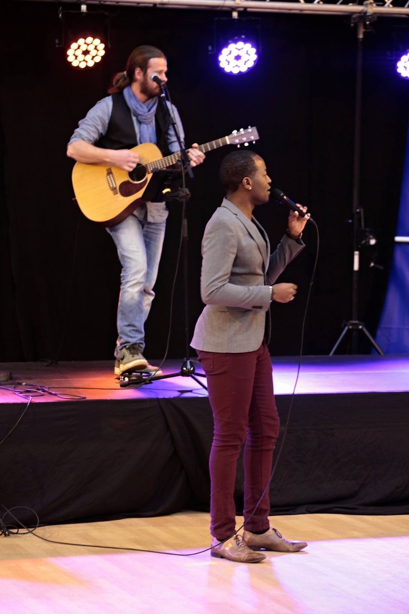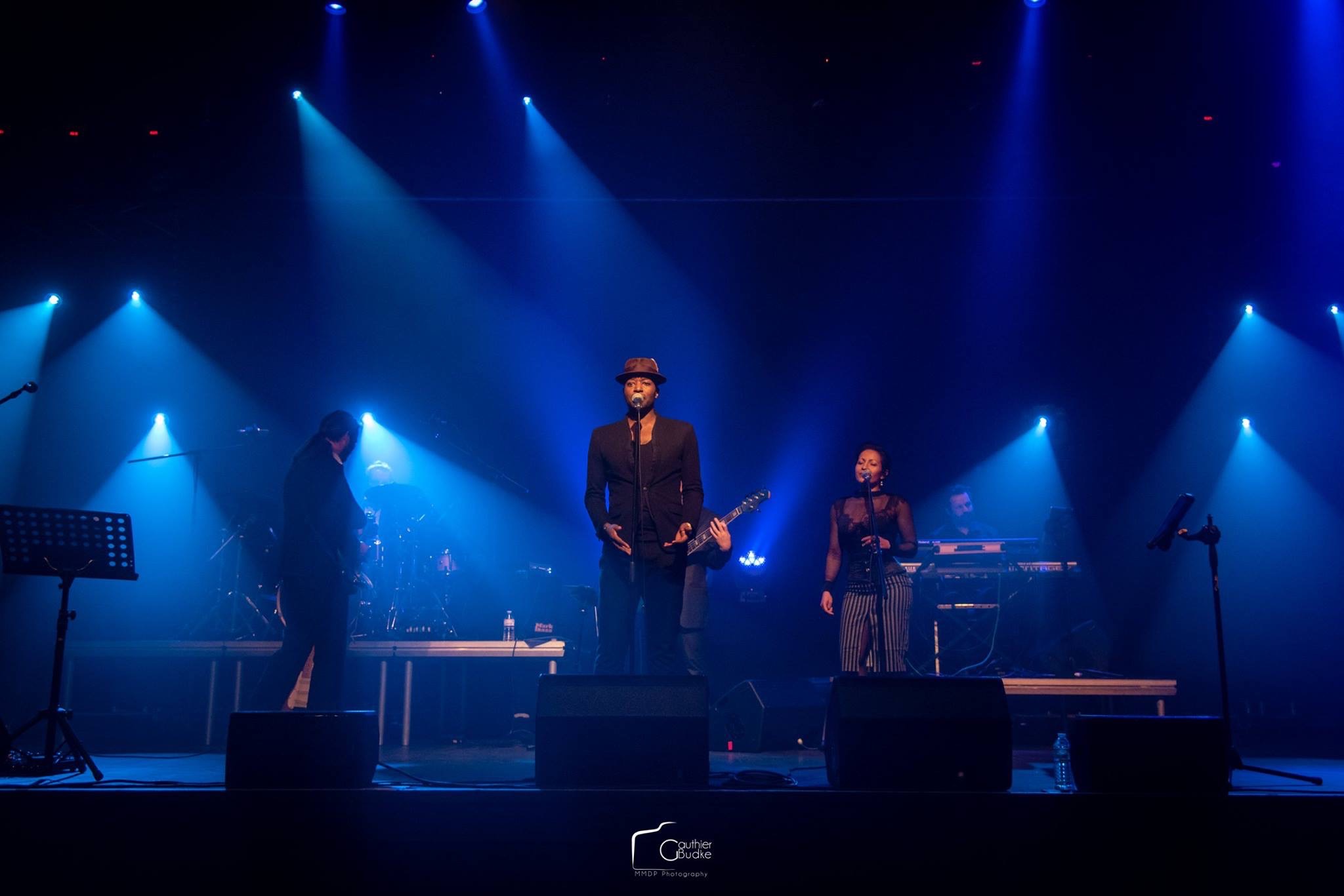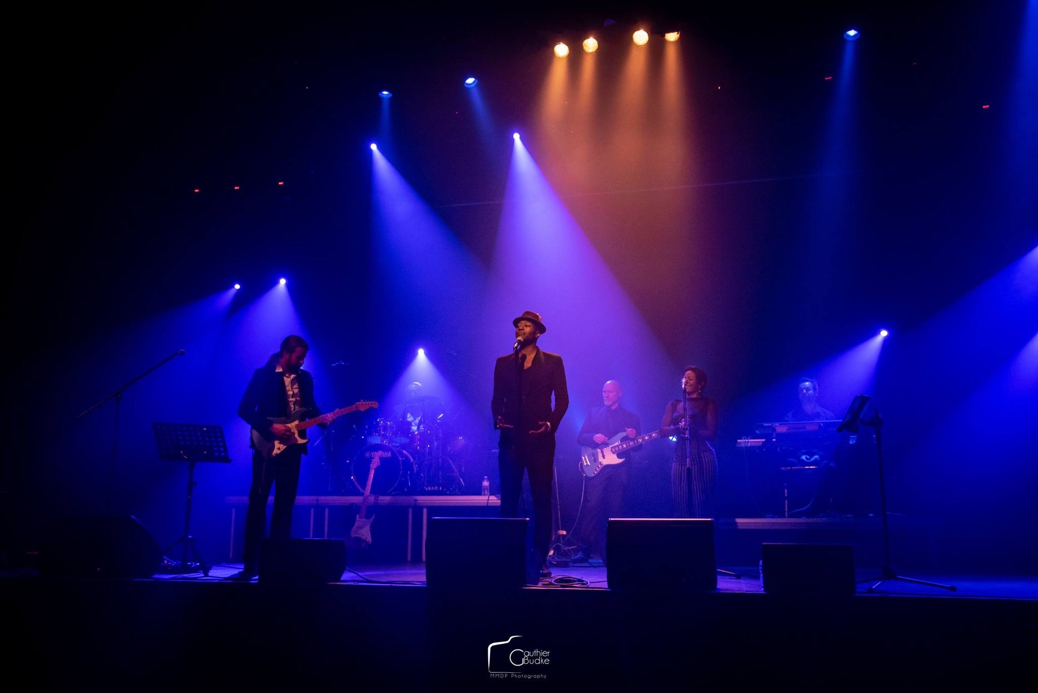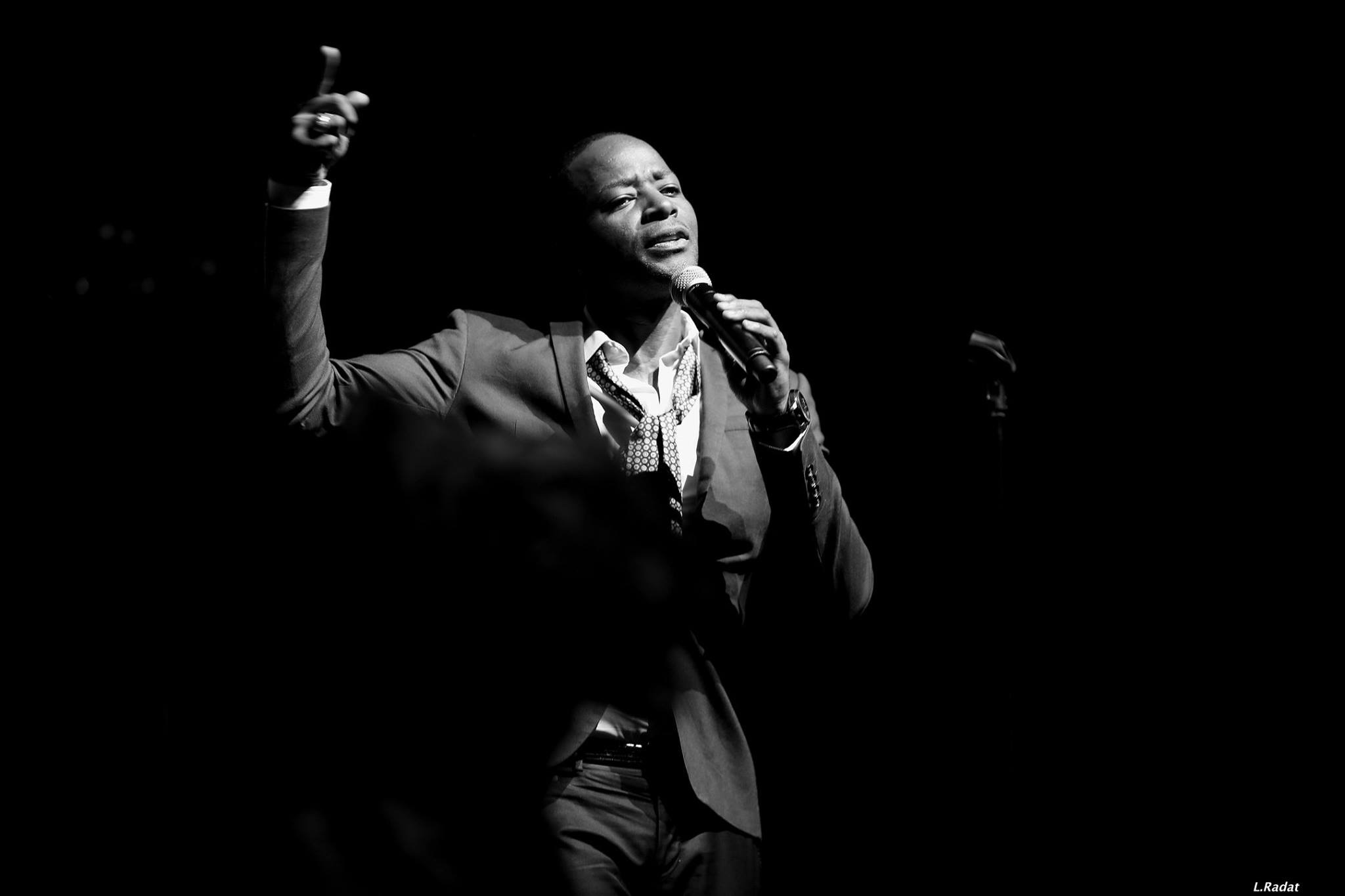Plus de deux heures de spectacle qui ont réjoui le publique et qui a permis de récolter près de 3500 euros de dons qui seront reversés à la Cellule d’Aide aux Blessés de l’Armée de Terre. Chanteur accompagné par la musique des Forces Terrestres devant le publique.